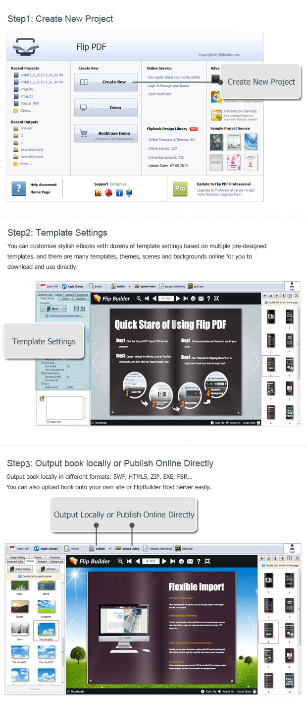 Con esta interface fácil de usar, puede crear e Libros de Adobe y HTML5 con doblez de página realista en menos de 10 minutos. Simplemente importe un libro PDF y seleccione una plantilla pre-diseñada, puede generar una revista profesional o un folleto con cambio de página inspirador con facilidad. Sin habilidades de codificación y diseño necesarias!! |